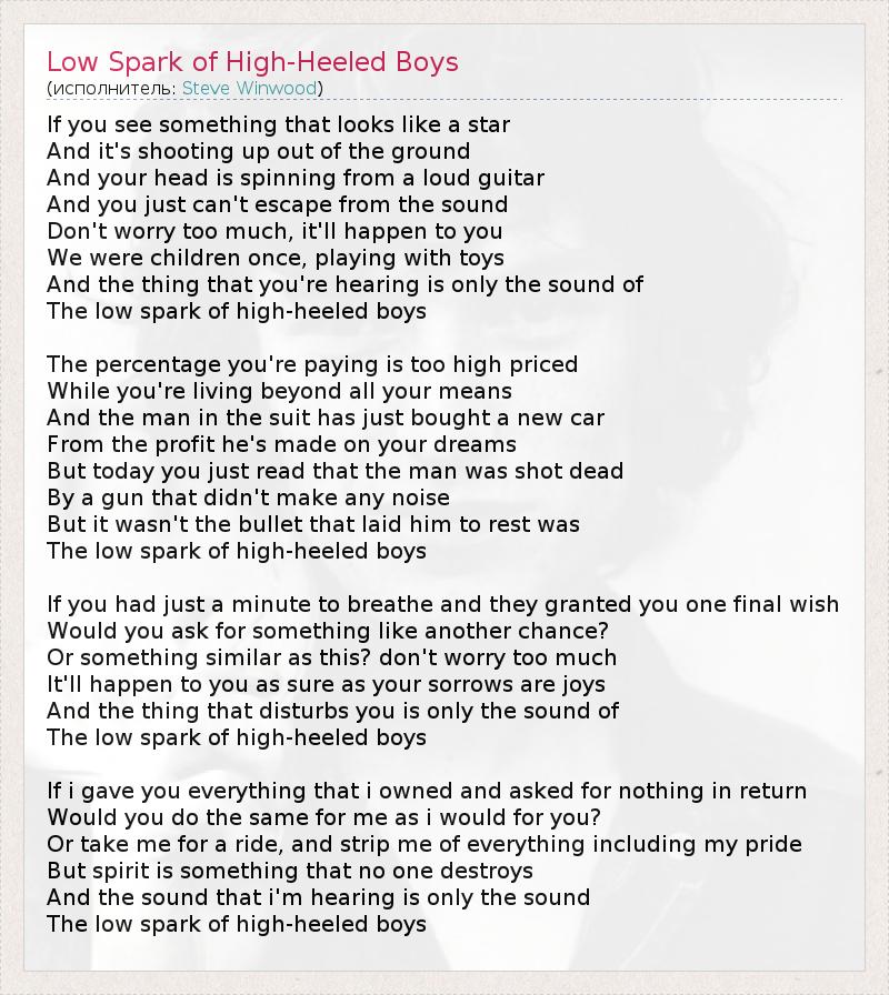 If you see something that looks like a star And it's shooting up out of the ground And your head is spinning from a loud guitar And you just can't escape from the sound Don't worry too much, it'll happen to you We were children once, playing with toys And the thing that you're hearing is only the sound of The low spark of high-heeled boys The percentage you're paying is too high priced While you're living beyond all your means And the man in the suit has just bought a new car From the profit he's made on your dreams But today you just read that the man was shot dead By a gun that didn't make any noise But it wasn't the bullet that laid him to rest was The low spark of high-heeled boys If you had just a minute to breathe and they granted you one final wish Would you ask for something like another chance? Or something similar as this? don't worry too much It'll happen to you as sure as your sorrows are joys And the thing that disturbs you is only the sound of The low spark of high-heeled boys If i gave you everything that i owned and asked for nothing in return Would you do the same for me as i would for you? Or take me for a ride, and strip me of everything including my pride But spirit is something that no one destroys And the sound that i'm hearing is only the sound The low spark of high-heeled boys