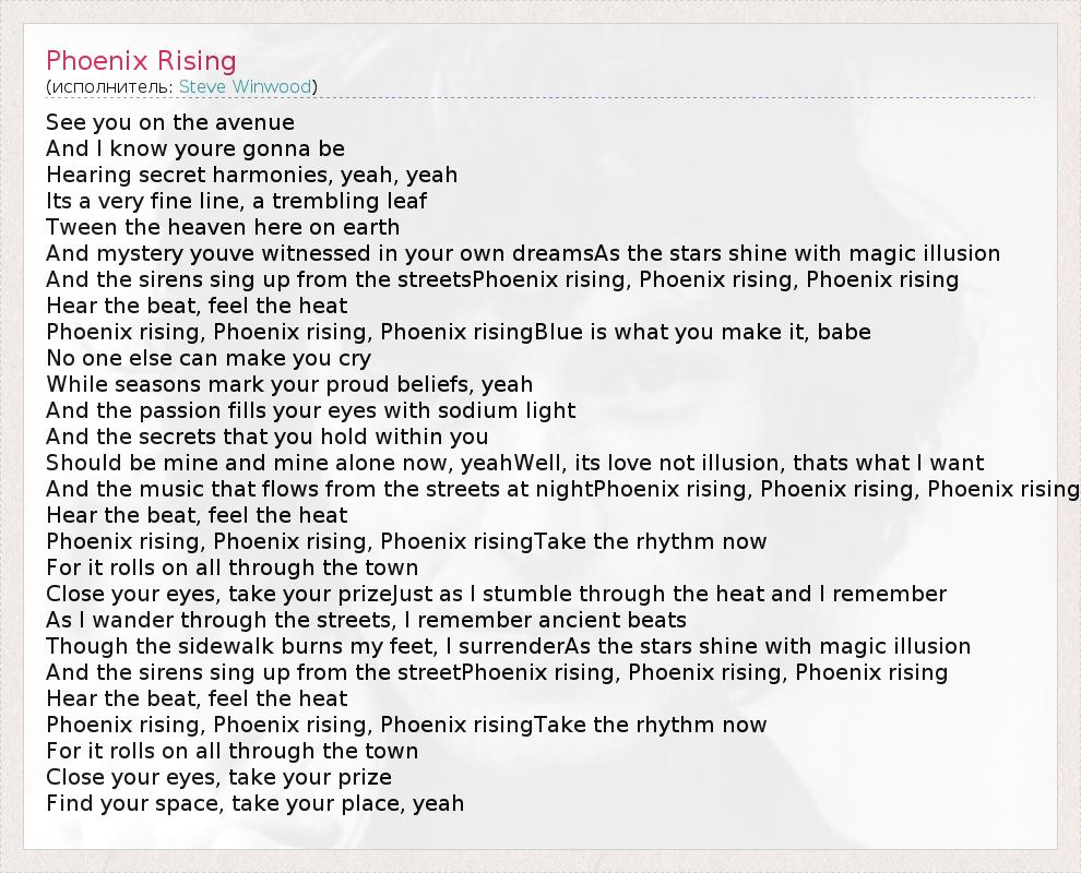 And the sirens sing up from the streetPhoenix rising, Phoenix rising, Phoenix rising