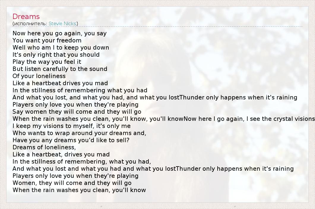 Это интересно:Стиви Никс родилась 26 мая 1948 года в Финиксе, штат Аризона, США. Она является одной из талантливейших и известнейших американских исполнительниц, обладательницей большого количества музыкальных премий и наград. Особую популярность получила благодаря работе в рамках группы Fleetwood Mac. Певица исполняет свои композиции в лирическом, но в то же самое время тяжелом стиле, тем самым создавая... продолжение