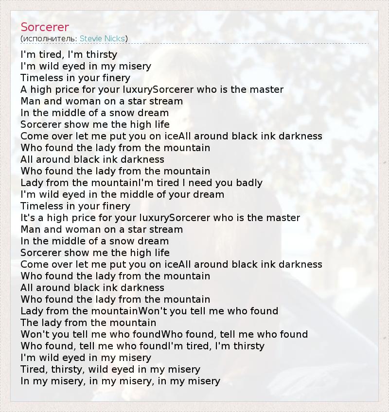 I'm tired, I'm thirsty I'm wild eyed in my misery Timeless in your finery A high price for your luxurySorcerer who is the master Man and woman on a star stream In the middle of a snow dream Sorcerer show me the high life Come over let me put you on iceAll around black ink darkness Who found the lady from the mountain All around black ink darkness Who found the lady from the mountain Lady from the mountainI'm tired I need you badly I'm wild eyed in the middle of your dream Timeless in your finery It's a high price for your luxurySorcerer who is the master Man and woman on a star stream In the middle of a snow dream Sorcerer show me the high life Come over let me put you on iceAll around black ink darkness Who found the lady from the mountain All around black ink darkness Who found the lady from the mountain Lady from the mountainWon't you tell me who found The lady from the mountain Won't you tell me who foundWho found, tell me who found Who found, tell me who foundI'm tired, I'm thirsty I'm wild eyed in my misery Tired, thirsty, wild eyed in my misery In my misery, in my misery, in my misery