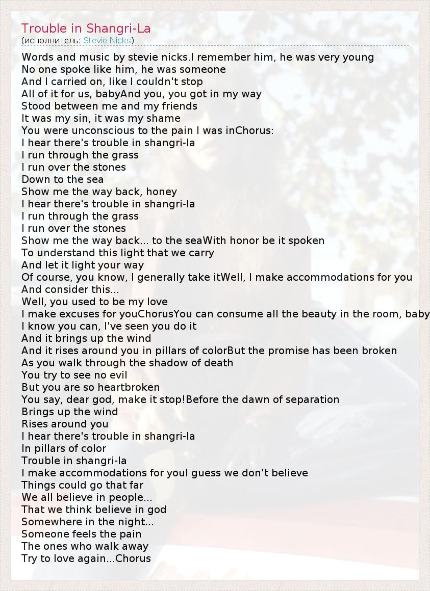 Words and music by stevie nicks.I remember him, he was very young No one spoke like him, he was someone And I carried on, like I couldn't stop All of it for us, babyAnd you, you got in my way Stood between me and my friends It was my sin, it was my shame You were unconscious to the pain I was inChorus: I hear there's trouble in shangri-la I run through the grass I run over the stones Down to the sea Show me the way back, honey I hear there's trouble in shangri-la I run through the grass I run over the stones Show me the way back... to the seaWith honor be it spoken To understand this light that we carry And let it light your way Of course, you know, I generally take itWell, I make accommodations for you And consider this... Well, you used to be my love I make excuses for youChorusYou can consume all the beauty in the room, baby I know you can, I've seen you do it And it brings up the wind And it rises around you in pillars of colorBut the promise has been broken As you walk through the shadow of death You try to see no evil But you are so heartbroken You say, dear god, make it stop!Before the dawn of separation Brings up the wind Rises around you I hear there's trouble in shangri-la In pillars of color Trouble in shangri-la I make accommodations for youI guess we don't believe Things could go that far We all believe in people... That we think believe in god Somewhere in the night... Someone feels the pain The ones who walk away Try to love again...Chorus