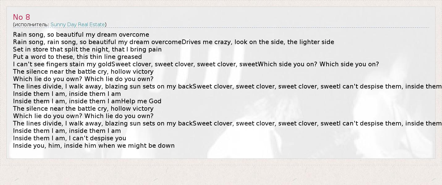 Это интересно:Sunny Day Real Estate (или SDRE) (с англ. Собственность солнечного дня) — американская альтернативная рок-группа из города Сиэттл, штат Вашингтон. Группа образовалась в 1992 году под первоначальным названием «Empty Set» и включала в себя Дэна Хэрнера (гитара, вокал), Нэйта Мэндела (бас) и Уильяма Голдсмита (барабаны).Ребята записали демо под этим названием, но тут вдруг обнаружилось,... продолжение
