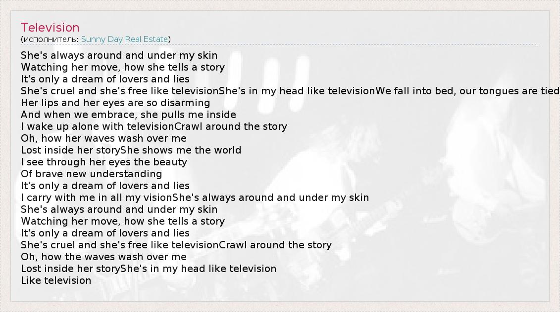 She's always around and under my skin Watching her move, how she tells a story It's only a dream of lovers and lies She's cruel and she's free like televisionShe's in my head like televisionWe fall into bed, our tongues are tied Her lips and her eyes are so disarming And when we embrace, she pulls me inside I wake up alone with televisionCrawl around the story Oh, how her waves wash over me Lost inside her storyShe shows me the world I see through her eyes the beauty Of brave new understanding It's only a dream of lovers and lies I carry with me in all my visionShe's always around and under my skin She's always around and under my skin Watching her move, how she tells a story It's only a dream of lovers and lies She's cruel and she's free like televisionCrawl around the story Oh, how the waves wash over me Lost inside her storyShe's in my head like television Like television