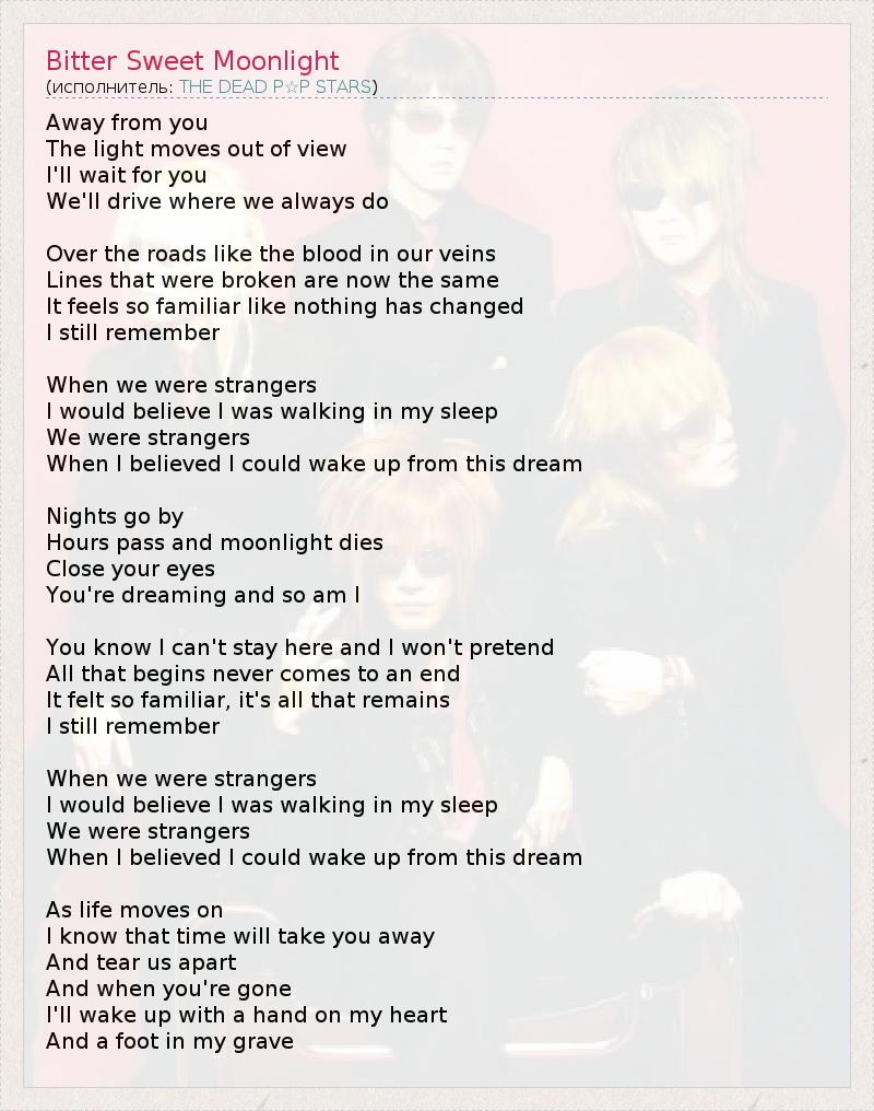 Вдаль от тебя, Свет ускользает из виду. Я дождусь тебя, Мы отправимся в наше привычное место... По дорогам, словно текущая по венам кровь, Линии, прежде разорванные, теперь снова срослись. Всё кажется знакомым, будто ничего не изменилось, И я по-прежнему помню... Те времена, когда мы не были знакомы, И я бы поверила, что бродила во сне. Мы были незнакомцами, Когда я поверила, что смогу пробудиться. Ночи проходят, Минуют часы, лунный свет гаснет. Закрой глаза, Ты видишь сон, я тоже... Не стану лгать - я не могу остаться, и ты это знаешь, У всего есть начало, но никогда нет конца. Всё казалось таким знакомым – это всё, что осталось, И я по-прежнему помню... Те времена, когда мы не были знакомы, И я бы поверила, что бродила во сне. Мы были незнакомцами, Когда я поверила, что смогу пробудиться. В потоке жизни Я точно знаю, что время отнимет тебя И разлучит нас, А когда тебя не станет, Я проснусь со скрещенными руками И почти в могиле.