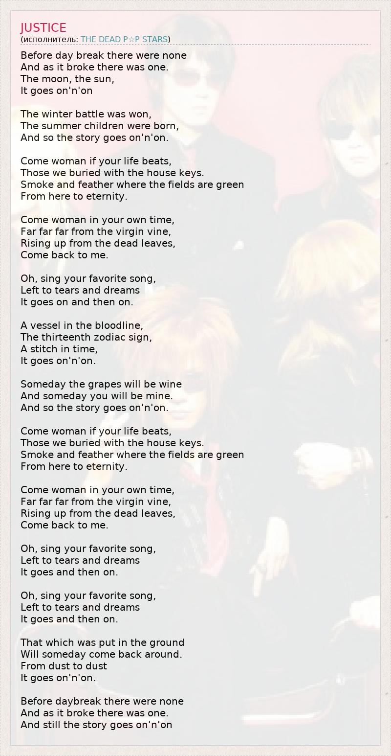 Before day break there were none And as it broke there was one. The moon, the sun, It goes on'n'on The winter battle was won, The summer children were born, And so the story goes on'n'on. Come woman if your life beats, Those we buried with the house keys. Smoke and feather where the fields are green From here to eternity. Come woman in your own time, Far far far from the virgin vine, Rising up from the dead leaves, Come back to me. Oh, sing your favorite song, Left to tears and dreams It goes on and then on. A vessel in the bloodline, The thirteenth zodiac sign, A stitch in time, It goes on'n'on. Someday the grapes will be wine And someday you will be mine. And so the story goes on'n'on. Come woman if your life beats, Those we buried with the house keys. Smoke and feather where the fields are green From here to eternity. Come woman in your own time, Far far far from the virgin vine, Rising up from the dead leaves, Come back to me. Oh, sing your favorite song, Left to tears and dreams It goes and then on. Oh, sing your favorite song, Left to tears and dreams It goes and then on. That which was put in the ground Will someday come back around. From dust to dust It goes on'n'on. Before daybreak there were none And as it broke there was one. And still the story goes on'n'on