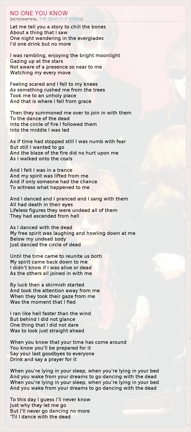 Позвольте рассказать вам историю, пробирающую до костей, О том, что я увидел Одной ночью, блуждая по болотам... Тогда я выпил одну бутылку, но не более того. Я околачивался там, наслаждаясь ярким лунным светом, Глазея на звёзды, Не подозревая, что кто-то около меня Наблюдает за каждым моим движением. Испугавшись, я упал на колени, Так как нечто бросилось на меня с деревьев И унесло в зловещее место – Я лишился Божьей благодати... Затем они позвали меня присоединиться К танцу мертвецов, Я последовал за ними в огненный круг, Они привели меня в середину. Время будто остановилось, я оцепенел от страха, Но несмотря на это, мне хотелось идти, И пламя огня не причиняло мне вреда, Хотя я шёл по углям. Я ощущал себя словно в трансе, И мой дух вышел из меня, И если бы хоть кто-нибудь имел шанс Засвидетельствовать то, что со мной произошло. И я танцевал, гарцевал, пел вместе с ними, У них у всех смерть была в глазах. Безжизненные фигуры, каждый из них был нежитью, Восставшие из ада. Пока я танцевал с мертвецами, Мой свободный дух смеялся и заглушал меня своим воем. Под ним моё зомбированное тело Танцевало в кругу мертвецов. Ещё до того момента, когда нам следовало воссоединиться, Мой дух вернулся ко мне. Я не понимал, жив я или мёртв, Как и все остальные, присоединившиеся ко мне. Но на моё везение, началась перепалка, И она отвлекла их внимание. Когда они отвели свой пристальный взгляд от меня, Я, воспользовавшись моментом, сбежал. Я бежал изо всех сил, быстрее ветра, Не оглядываясь назад – На это у меня не хватало смелости. Я смотрел только вперёд. Когда вы поймёте, что ваше время пришло, Вы знаете, что будете к этому готовы. Скажите всем последнее «прощай», Выпейте и помолитесь за них. Когда вы спите, лёжа в своей постели, Вы просыпаетесь и идёте танцевать с мертвецами. Когда вы спите, лёжа в своей постели, Вы просыпаетесь и идёте танцевать с мертвецами. И по сей день, мне кажется, я никогда не узнаю, Почему они отпустили меня. Но я больше никогда не пойду танцевать, После того, как танцевал с мертвецами.