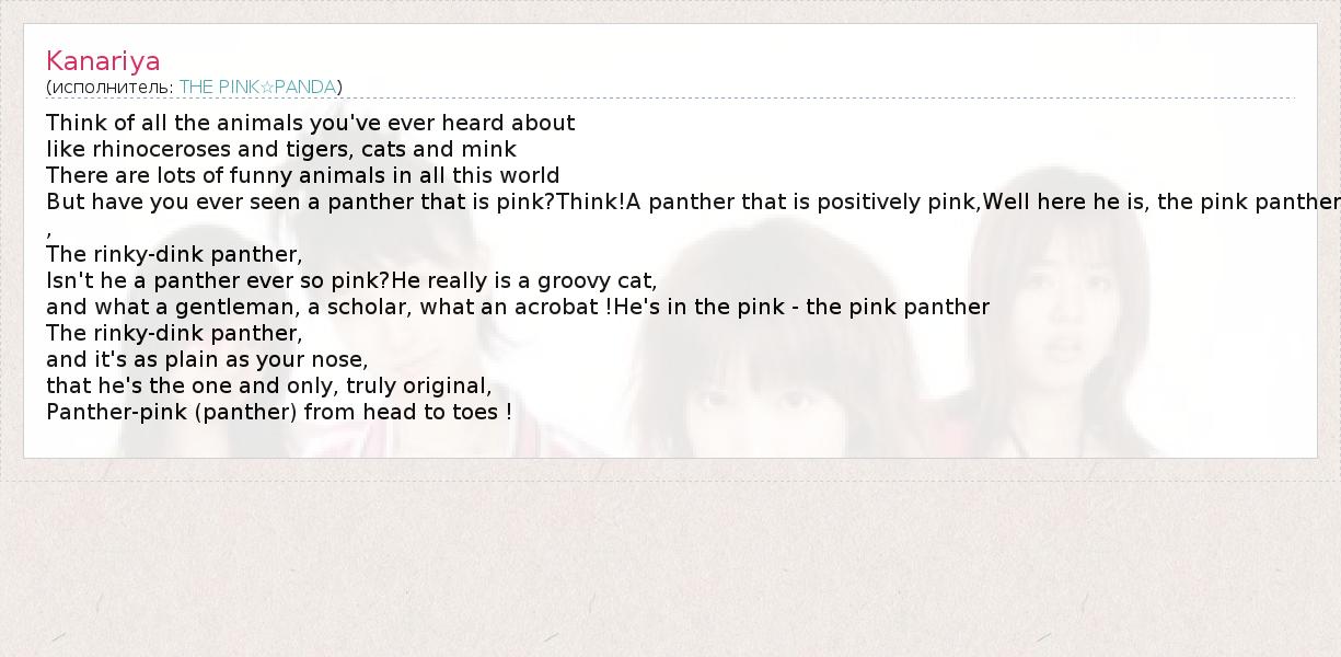 Think of all the animals you've ever heard about like rhinoceroses and tigers, cats and mink There are lots of funny animals in all this world But have you ever seen a panther that is pink?Think!A panther that is positively pink,Well here he is, the pink panther , The rinky-dink panther, Isn't he a panther ever so pink?He really is a groovy cat, and what a gentleman, a scholar, what an acrobat !He's in the pink - the pink panther The rinky-dink panther, and it's as plain as your nose, that he's the one and only, truly original, Panther-pink (panther) from head to toes !