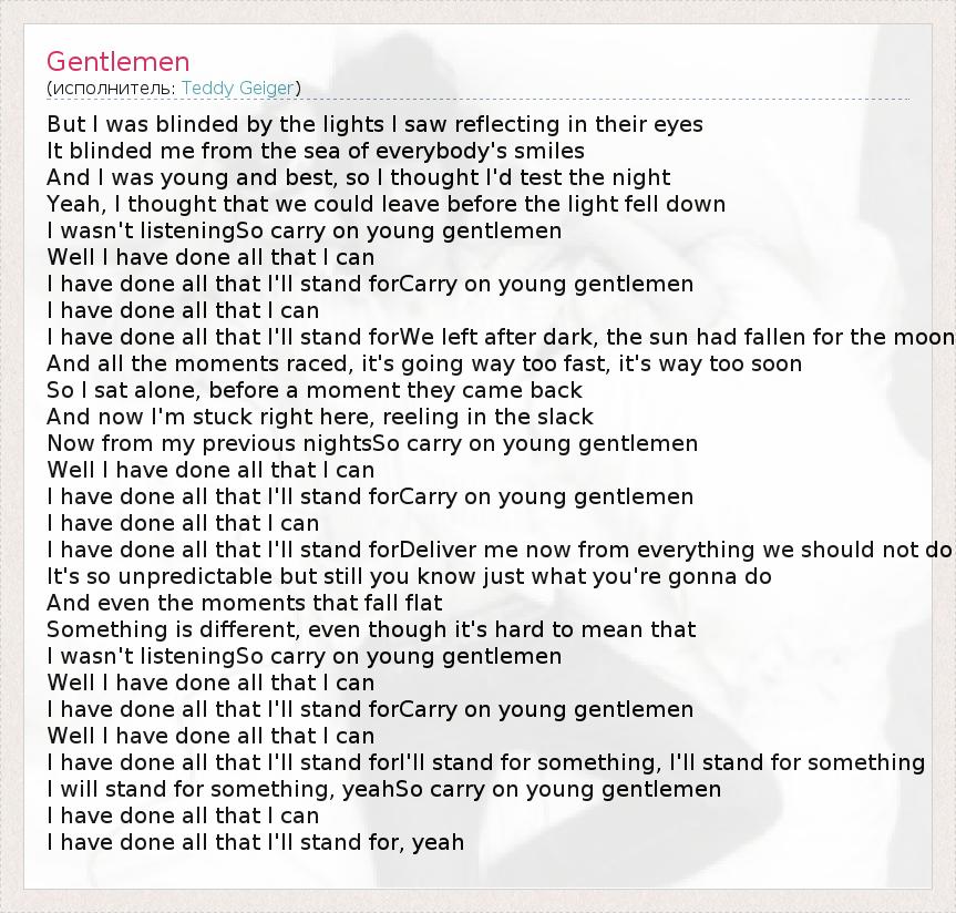 But I was blinded by the lights I saw reflecting in their eyes It blinded me from the sea of everybody's smiles And I was young and best, so I thought I'd test the night Yeah, I thought that we could leave before the light fell down I wasn't listeningSo carry on young gentlemen Well I have done all that I can I have done all that I'll stand forCarry on young gentlemen I have done all that I can I have done all that I'll stand forWe left after dark, the sun had fallen for the moon And all the moments raced, it's going way too fast, it's way too soon So I sat alone, before a moment they came back And now I'm stuck right here, reeling in the slack Now from my previous nightsSo carry on young gentlemen Well I have done all that I can I have done all that I'll stand forCarry on young gentlemen I have done all that I can I have done all that I'll stand forDeliver me now from everything we should not do It's so unpredictable but still you know just what you're gonna do And even the moments that fall flat Something is different, even though it's hard to mean that I wasn't listeningSo carry on young gentlemen Well I have done all that I can I have done all that I'll stand forCarry on young gentlemen Well I have done all that I can I have done all that I'll stand forI'll stand for something, I'll stand for something I will stand for something, yeahSo carry on young gentlemen I have done all that I can I have done all that I'll stand for, yeah