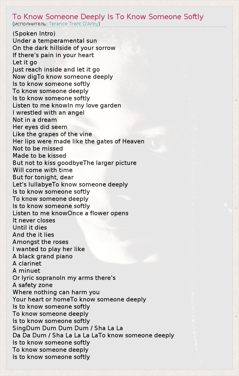 ГлавнаяИсполнителиTerence Trent D'ArbyTo Know Someone Deeply Is To Know Someone Softly