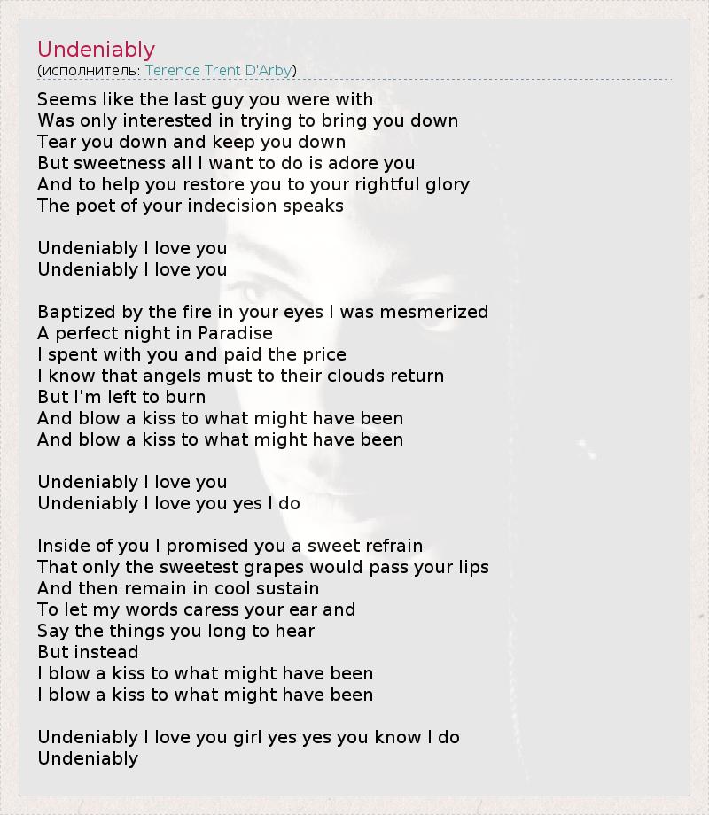 Это интересно:Terence Trent D''Arby - американский певец, композитор и автор текстов (настоящее имя Terence Trent Howard). Тэрэнс родился 15 марта 1962 года в нью-йоркском районе Манхэттэн. В настоящее время проживает в Милане (Италия). Обладая ярким голосом, напоминающим голос знаменитого Сэма Кука (Sam Cooke), молодой певец обратил на себя внимание ещё в школьные годы. В творчестве D''Arby можно найти влияние таких суперзвёзд,... продолжение