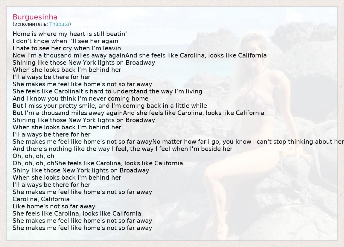 But I'm a thousand miles away againAnd she feels like Carolina, looks like California