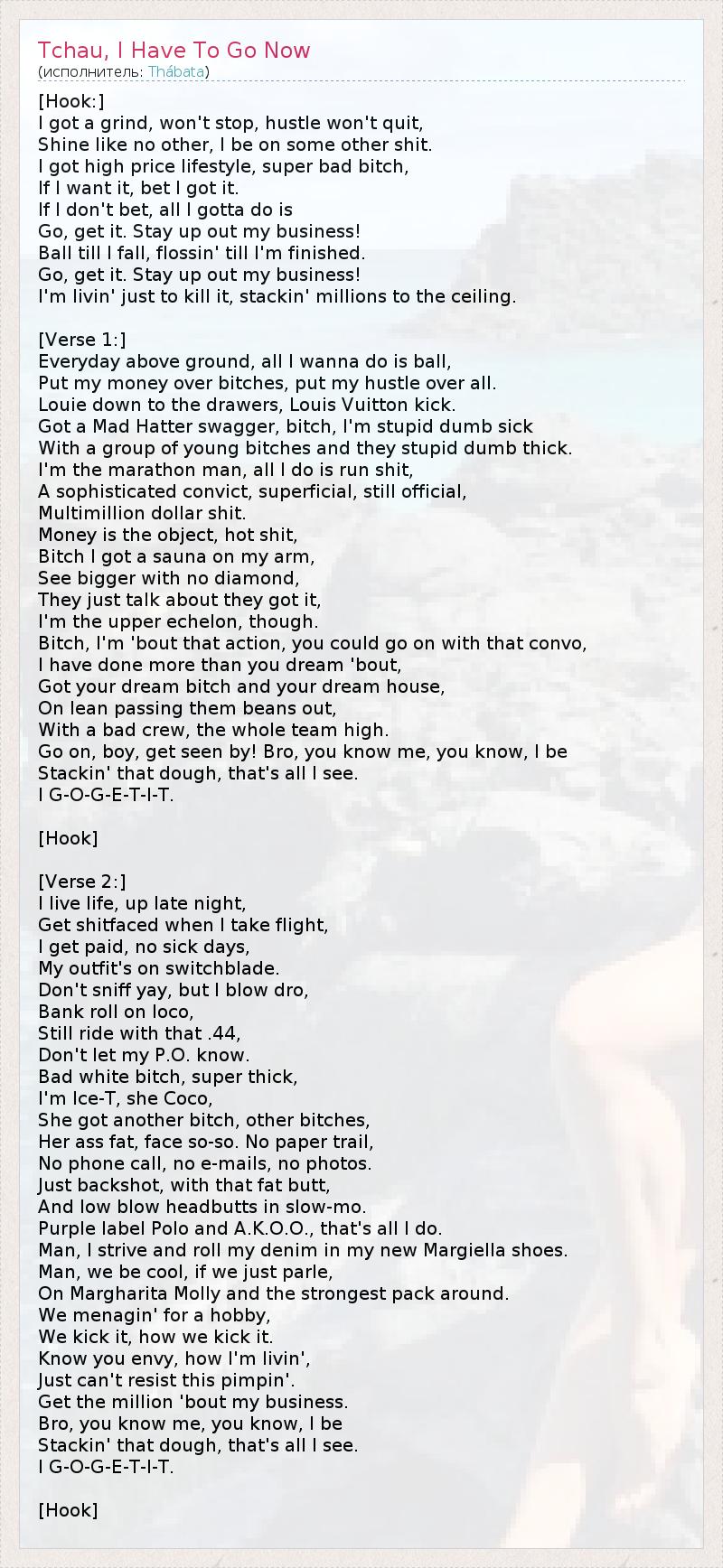 [Хук:] Я тружусь и не остановлюсь, не выйду из игры, Сияю, как никто иной, я в совершенно ином измерении. Веду дорогостоящую жизнь, сверхразвратная шл*ха, Если мне чего-то захочется, бьюсь об заклад, у меня это уже есть. А если я не уверен, то всё, что нужно - Пойти и взять это. Держись подальше от моих дел! Блистаю, пока не потерпел поражение, рисуюсь, пока не выдохнусь. Иди и возьми это. Держись подальше от моих дел! Цель жизни - прожигать её, набит миллионами до потолка. [Куплет 1:] Каждый день, что ещё хожу по Земле, всё, чего я хочу - выделяться, Ставлю деньги превыше бл**ей, ставлю дело превыше всего. Прикинут в Louie 1 вплоть до трусов, кроссовки от Louis Vuitton. Стиль Безумного Шляпника, 2 с**а, я устал до отупения От кучек молодых шалав, чересчур глупых и посредственных. Я марафонец, я имею власть над этой х**нёй, Искушённый з/к, но ещё официальный, наносной, Многомиллионное дер*мо. Деньги - вот цель, срочная и бесповоротная, Шлюха, руки горят, будто из сауны, Я круче, хоть и без бриллиантов, А остальные просто говорят, что они у них есть, Я, блин, из высших эшелонов. С**а, я собираюсь сделать это, а ты можешь продолжать трепаться и дальше, Мои успехи превосходят твои мечты, У меня бл**ь твоей мечты и такой же дом, Пропускаю таблеточки, хоть уже под кайфом, С серьёзными тылами, вся команда навеселе. Давай, пацан, обрати на себя внимание! Братан, ты знаешь меня, ты знаешь, что я буду Накапливать средства, больше я ничего не вижу. И-Д-У-И-Б-Е-Р-У! [Хук] [Куплет 2:] Я живу ярко, не сплю и поздно ночью, Ох**неваю, когда принимаю, Рублю бабло, без тухлых дней, Мой инструмент - финка, Не занюхиваю, но закуриваю, Безумные цифры на банковском счету, Всё ещё езжу с 44 калибром, Моему надзирателю не надо этого знать. Развратная белая шл*шка и очень толстая, Я Ice-T, она Коко, 3 У неё свои с**ки, они другие, У неё жирная зад**ца, а морда так себе. Без переписки, Без звонков, без электронных писем, без фото. Я пристраиваюсь сзади к этой жирной ж*пе, И глубокие минеты в замедленной съёмке. Фиолетовый логотип Polo 4 и A.K.O.O. 5 - вот всё, чем я занимаюсь. Чел, поднатужусь и заправлю джинсы в новые туфли от Margelia. 6 Чел, мы круты даже на расслабоне Под экстази и крепкой травой. Групповушка потехи ради, Мы делаем только так, как мы одни. Знаю, как вы завидуете моей жизни, Я просто не могу устоять перед показухой. Бизнес приносит мне миллионы. Братан, ты знаешь меня, ты знаешь, что я буду Накапливать средства, больше я ничего не вижу. И-Д-У-И-Б-Е-Р-У! [Хук] 1 - Французский дом моды, специализирующийся на производстве чемоданов и сумок, модной одежды и аксессуаров класса "люкс" под одноимённой торговой маркой. 2 - Суперзлодей из вселенной DC Comics, враг Бэтмена. 3 - Ice-T - псевдоним Трэйси Марроу, рэппера, актёра и автора, обладателя наград Grammy Award и NAACP Image Award, известного как исполнитель гангста-рэпа в конце 1980-х. В начале 2005 года Ice-T женился на модели Николь "Коко-Мэри" Остин. 4 - Американская марка одежды. 5 - "A King Of Oneself" - марка одежды от T.I. и Джейсона Гетера. 6 - Мартин Маргелия - бельгийский дизайнер одежды.