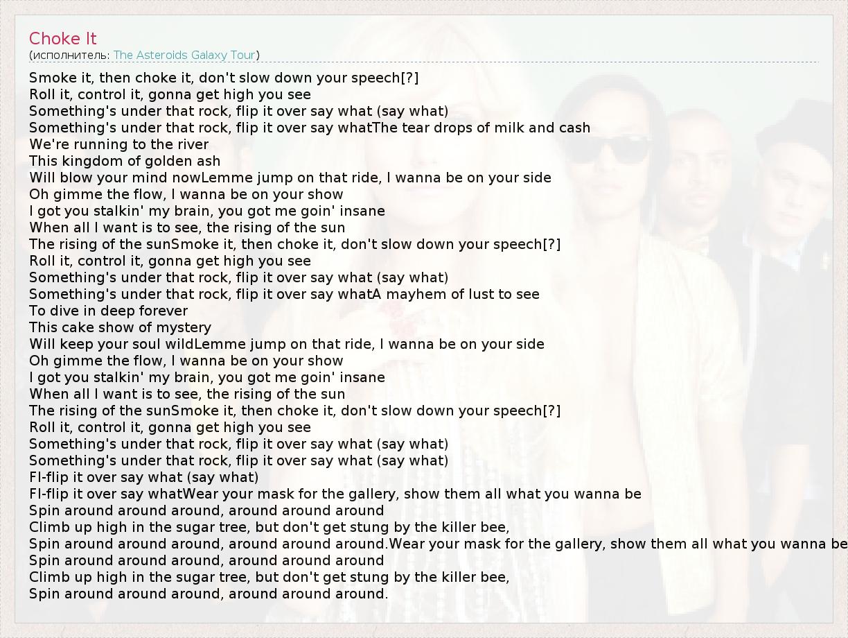 Smoke it, then choke it, don't slow down your speech[?] Roll it, control it, gonna get high you see Something's under that rock, flip it over say what (say what) Something's under that rock, flip it over say whatThe tear drops of milk and cash We're running to the river This kingdom of golden ash Will blow your mind nowLemme jump on that ride, I wanna be on your side Oh gimme the flow, I wanna be on your show I got you stalkin' my brain, you got me goin' insane When all I want is to see, the rising of the sun The rising of the sunSmoke it, then choke it, don't slow down your speech[?] Roll it, control it, gonna get high you see Something's under that rock, flip it over say what (say what) Something's under that rock, flip it over say whatA mayhem of lust to see To dive in deep forever This cake show of mystery Will keep your soul wildLemme jump on that ride, I wanna be on your side Oh gimme the flow, I wanna be on your show I got you stalkin' my brain, you got me goin' insane When all I want is to see, the rising of the sun The rising of the sunSmoke it, then choke it, don't slow down your speech[?] Roll it, control it, gonna get high you see Something's under that rock, flip it over say what (say what) Something's under that rock, flip it over say what (say what) Fl-flip it over say what (say what) Fl-flip it over say whatWear your mask for the gallery, show them all what you wanna be Spin around around around, around around around Climb up high in the sugar tree, but don't get stung by the killer bee, Spin around around around, around around around.Wear your mask for the gallery, show them all what you wanna be Spin around around around, around around around Climb up high in the sugar tree, but don't get stung by the killer bee, Spin around around around, around around around.