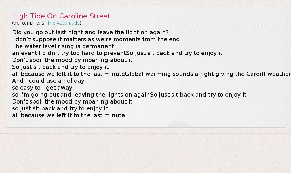 А как ты думаешь, о чем песня "High Tide On Caroline Street" ?