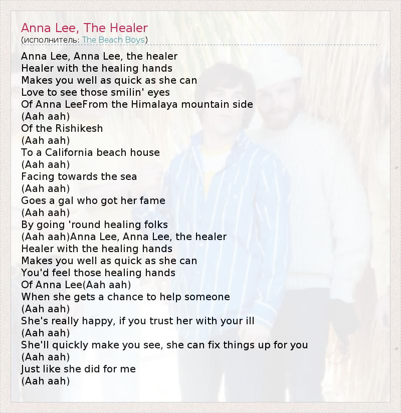 Anna Lee, Anna Lee, the healer Healer with the healing hands Makes you well as quick as she can Love to see those smilin' eyes Of Anna LeeFrom the Himalaya mountain side (Aah aah) Of the Rishikesh (Aah aah) To a California beach house (Aah aah) Facing towards the sea (Aah aah) Goes a gal who got her fame (Aah aah) By going 'round healing folks (Aah aah)Anna Lee, Anna Lee, the healer Healer with the healing hands Makes you well as quick as she can You'd feel those healing hands Of Anna Lee(Aah aah) When she gets a chance to help someone (Aah aah) She's really happy, if you trust her with your ill (Aah aah) She'll quickly make you see, she can fix things up for you (Aah aah) Just like she did for me (Aah aah)