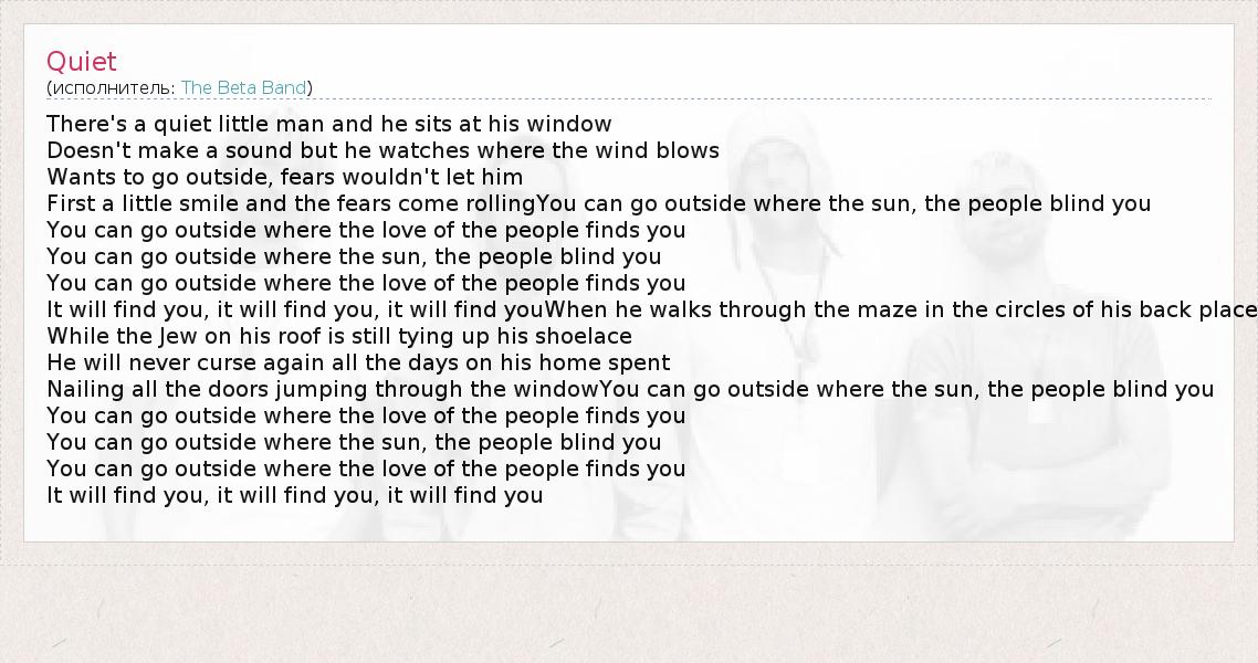 Это интересно:Коллектив Beta Band был основан тремя приятелями из Эдинбурга: Стивеном Мэйсоном (вокал), Робином Джонсом (ударные) и Джоном Маклином (ди-джеинг и сэмплеры). Чуть позже к ним примкнул бас-гитарист Ричард Гринтри Брайан и Кэннон, известный дизайнер, сделавший практически все обложки для пластинок Oasis. В Beta Band он занял место менеджера.В 1997 году вышел первый миньон «Champion Versions», на котором был... продолжение