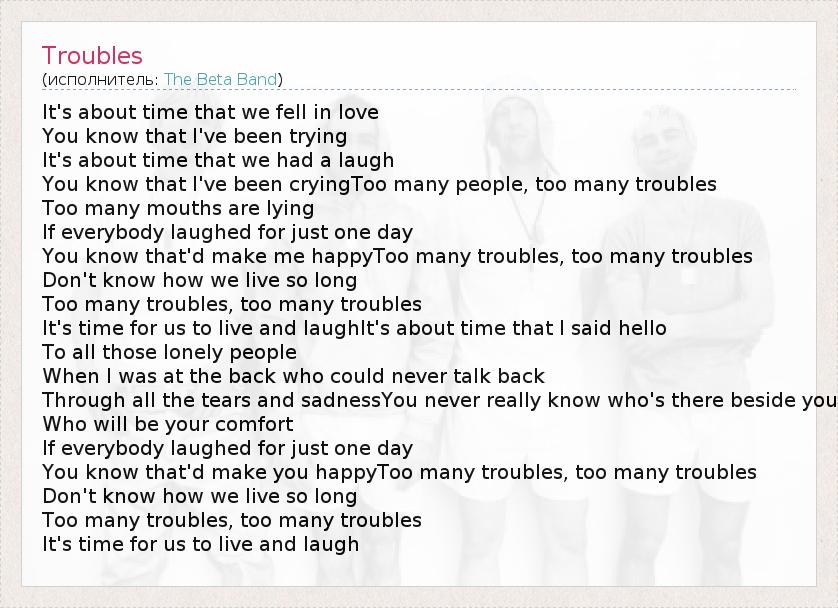 It's about time that we fell in love You know that I've been trying It's about time that we had a laugh You know that I've been cryingToo many people, too many troubles Too many mouths are lying If everybody laughed for just one day You know that'd make me happyToo many troubles, too many troubles Don't know how we live so long Too many troubles, too many troubles It's time for us to live and laughIt's about time that I said hello To all those lonely people When I was at the back who could never talk back Through all the tears and sadnessYou never really know who's there beside you Who will be your comfort If everybody laughed for just one day You know that'd make you happyToo many troubles, too many troubles Don't know how we live so long Too many troubles, too many troubles It's time for us to live and laugh