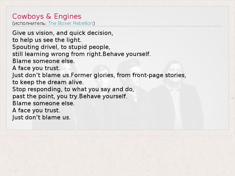 А как ты думаешь, о чем песня "Cowboys & Engines" ?