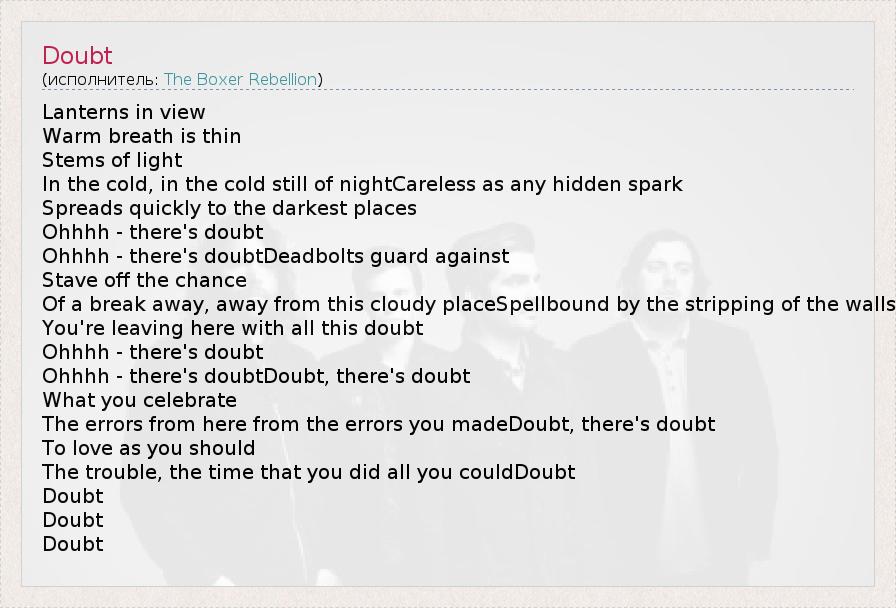 Это интересно:The Boxer Rebellion – международный рок-проект, в состав которого входят 4 участника из разных стран мира - Натан Николсон (Nathan Nicholson) (Vocals/Guitar/Keys) из США, Тодд Хоу (Todd Howe) (Lead Guitar) из Австралии и двое англичан - Адам Харрисон (Adam Harrison) (Bass Guitar) и Пьерс Хьюит (Piers Hewitt) (Drums). Группа впервые собралась в 2001 году. На их счету... продолжение