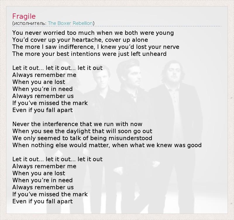 Это интересно:The Boxer Rebellion – международный рок-проект, в состав которого входят 4 участника из разных стран мира - Натан Николсон (Nathan Nicholson) (Vocals/Guitar/Keys) из США, Тодд Хоу (Todd Howe) (Lead Guitar) из Австралии и двое англичан - Адам Харрисон (Adam Harrison) (Bass Guitar) и Пьерс Хьюит (Piers Hewitt) (Drums). Группа впервые собралась в 2001 году. На их счету... продолжение