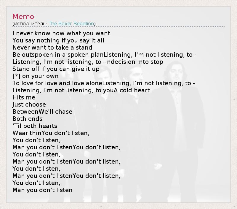 I never know now what you want You say nothing if you say it all Never want to take a stand Be outspoken in a spoken planListening, I'm not listening, to - Listening, I'm not listening, to -Indecision into stop Stand off if you can give it up [?] on your own To love for love and love aloneListening, I'm not listening, to - Listening, I'm not listening, to youA cold heart Hits me Just choose BetweenWe'll chase Both ends 'Til both hearts Wear thinYou don't listen, You don't listen, Man you don't listenYou don't listen, You don't listen, Man you don't listenYou don't listen, You don't listen, Man you don't listenYou don't listen, You don't listen, Man you don't listen
