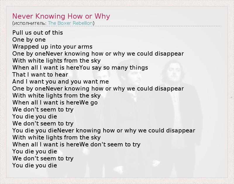 А как ты думаешь, о чем песня "Never Knowing How or Why" ?