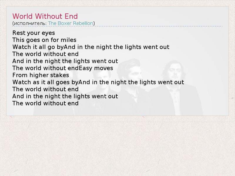 А как ты думаешь, о чем песня "World Without End" ?