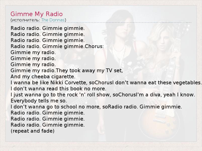А как ты думаешь, о чем песня "Gimme My Radio" ?