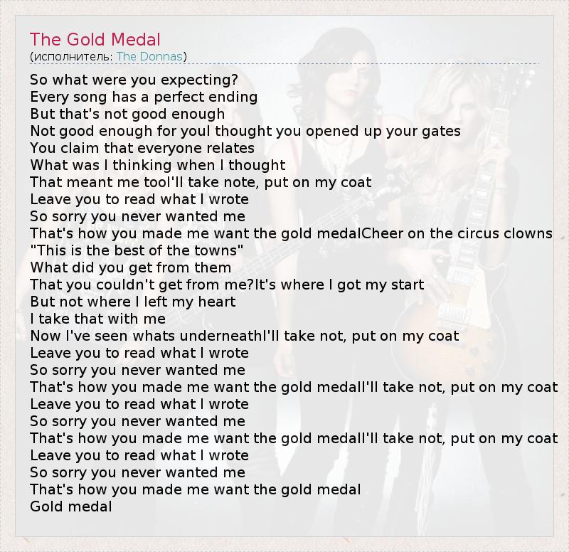 So what were you expecting? Every song has a perfect ending But that's not good enough Not good enough for youI thought you opened up your gates You claim that everyone relates What was I thinking when I thought That meant me tooI'll take note, put on my coat Leave you to read what I wrote So sorry you never wanted me That's how you made me want the gold medalCheer on the circus clowns "This is the best of the towns" What did you get from them That you couldn't get from me?It's where I got my start But not where I left my heart I take that with me Now I've seen whats underneathI'll take not, put on my coat Leave you to read what I wrote So sorry you never wanted me That's how you made me want the gold medalI'll take not, put on my coat Leave you to read what I wrote So sorry you never wanted me That's how you made me want the gold medalI'll take not, put on my coat Leave you to read what I wrote So sorry you never wanted me That's how you made me want the gold medal Gold medal