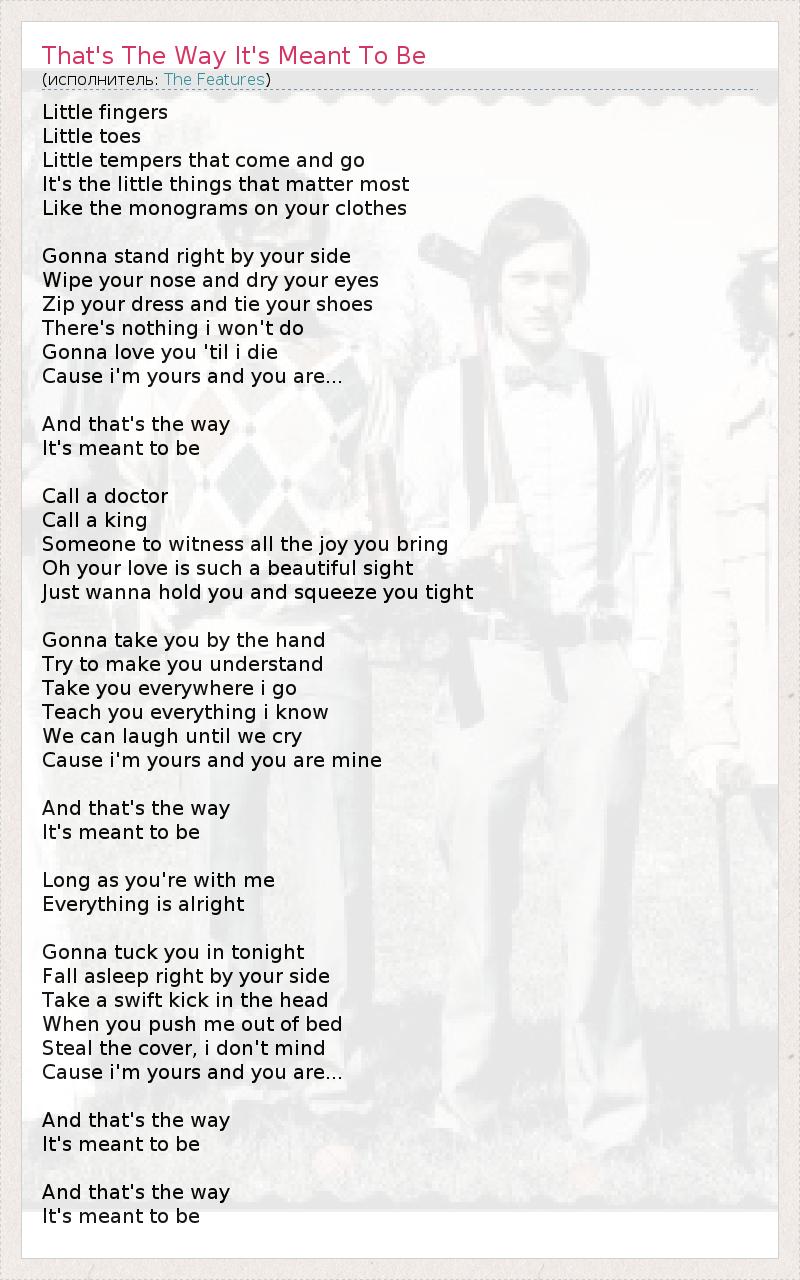 Little fingers Little toes Little tempers that come and go It's the little things that matter most Like the monograms on your clothes Gonna stand right by your side Wipe your nose and dry your eyes Zip your dress and tie your shoes There's nothing i won't do Gonna love you 'til i die Cause i'm yours and you are... And that's the way It's meant to be Call a doctor Call a king Someone to witness all the joy you bring Oh your love is such a beautiful sight Just wanna hold you and squeeze you tight Gonna take you by the hand Try to make you understand Take you everywhere i go Teach you everything i know We can laugh until we cry Cause i'm yours and you are mine And that's the way It's meant to be Long as you're with me Everything is alright Gonna tuck you in tonight Fall asleep right by your side Take a swift kick in the head When you push me out of bed Steal the cover, i don't mind Cause i'm yours and you are... And that's the way It's meant to be And that's the way It's meant to be