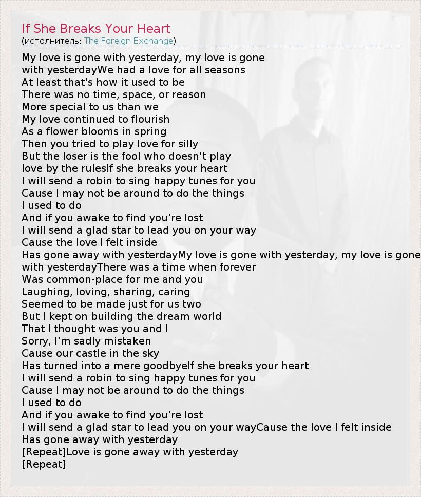 А как ты думаешь, о чем песня "If She Breaks Your Heart" ?