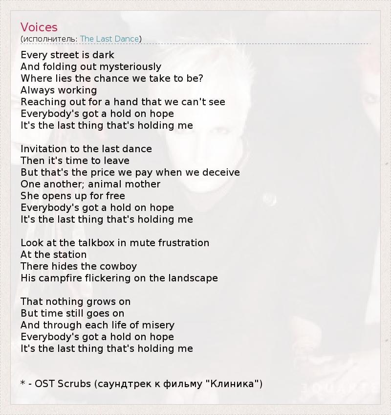 Это интересно:"Last Dance" - это американская дарквейв рок-группа из Южной Калифорнии, сформировавшаяся в 1990. Они выпустили 5 полнометражных альбомов, "ЕР", ремикс-альбои и документальнй фильм в 2007 гду под названием "почти прекрасен". Группа являеся одной из наиболее популярных групп 3 волны движения готического рока. Jeff Diehm (вокал), Rick Joyce (гитара), Tony Tullai ( бас) и Ian Haas (ударные) сформировали... продолжение
