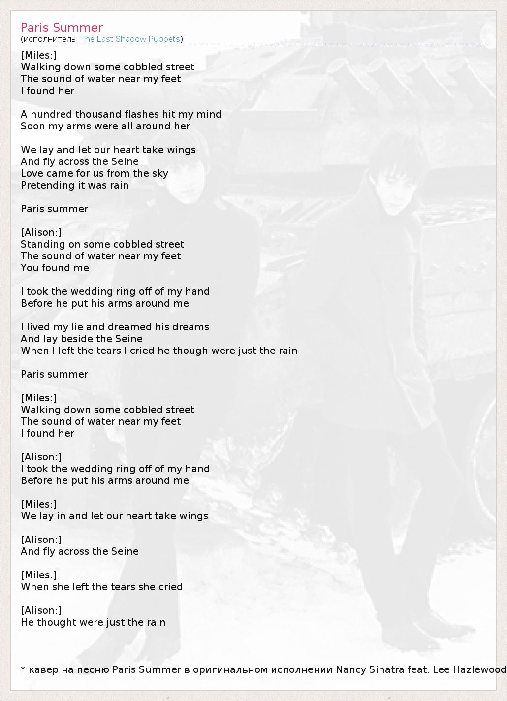 [Miles:] Walking down some cobbled street The sound of water near my feet I found her A hundred thousand flashes hit my mind Soon my arms were all around her We lay and let our heart take wings And fly across the Seine Love came for us from the sky Pretending it was rain Paris summer [Alison:] Standing on some cobbled street The sound of water near my feet You found me I took the wedding ring off of my hand Before he put his arms around me I lived my lie and dreamed his dreams And lay beside the Seine When I left the tears I cried he though were just the rain Paris summer [Miles:] Walking down some cobbled street The sound of water near my feet I found her [Alison:] I took the wedding ring off of my hand Before he put his arms around me [Miles:] We lay in and let our heart take wings [Alison:] And fly across the Seine [Miles:] When she left the tears she cried [Alison:] He thought were just the rain * кавер на песню Paris Summer в оригинальном исполнении Nancy Sinatra feat. Lee Hazlewood