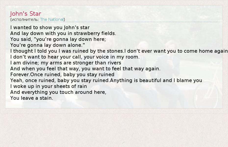I wanted to show you John's star And lay down with you in strawberry fields. You said, "you're gonna lay down here; You're gonna lay down alone." I thought I told you I was ruined by the stones.I don't ever want you to come home again I don't want to hear your call, your voice in my room. I am divine; my arms are stronger than rivers And when you feel that way, you want to feel that way again. Forever.Once ruined, baby you stay ruined Yeah, once ruined, baby you stay ruined.Anything is beautiful and I blame you I woke up in your sheets of rain And everything you touch around here, You leave a stain.