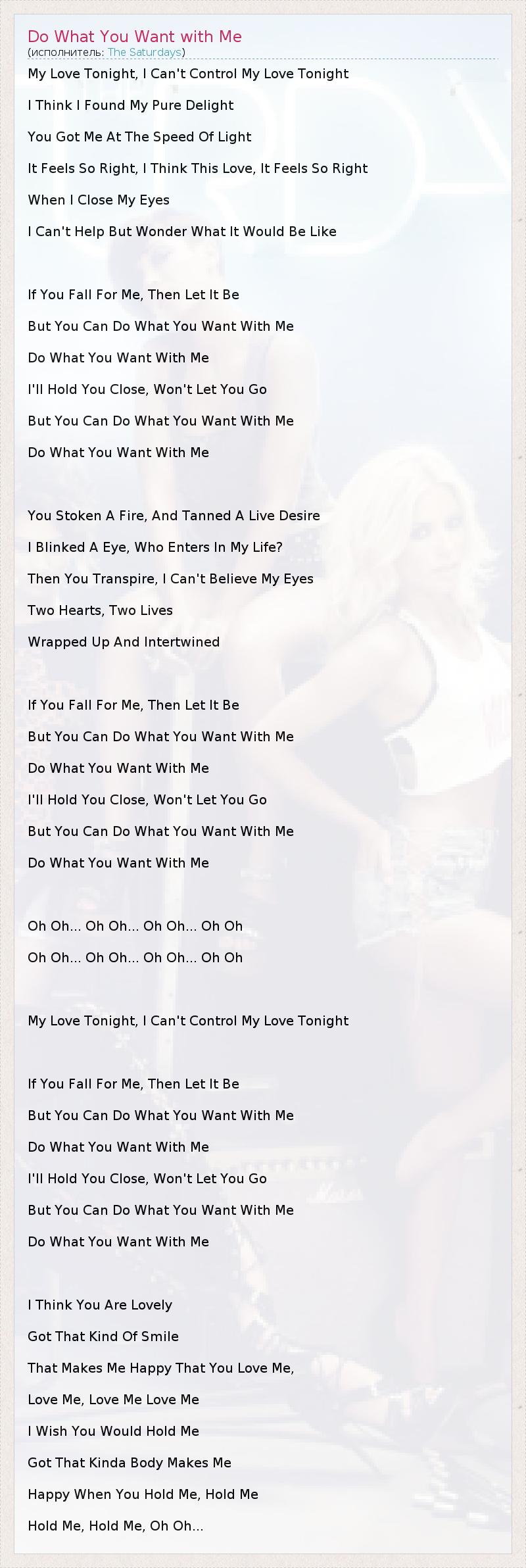 My Love Tonight, I Can't Control My Love Tonight I Think I Found My Pure Delight You Got Me At The Speed Of Light It Feels So Right, I Think This Love, It Feels So Right When I Close My Eyes I Can't Help But Wonder What It Would Be Like If You Fall For Me, Then Let It Be But You Can Do What You Want With Me Do What You Want With Me I'll Hold You Close, Won't Let You Go But You Can Do What You Want With Me Do What You Want With Me You Stoken A Fire, And Tanned A Live Desire I Blinked A Eye, Who Enters In My Life? Then You Transpire, I Can't Believe My Eyes Two Hearts, Two Lives Wrapped Up And Intertwined If You Fall For Me, Then Let It Be But You Can Do What You Want With Me Do What You Want With Me I'll Hold You Close, Won't Let You Go But You Can Do What You Want With Me Do What You Want With Me Oh Oh... Oh Oh... Oh Oh... Oh Oh Oh Oh... Oh Oh... Oh Oh... Oh Oh My Love Tonight, I Can't Control My Love Tonight If You Fall For Me, Then Let It Be But You Can Do What You Want With Me Do What You Want With Me I'll Hold You Close, Won't Let You Go But You Can Do What You Want With Me Do What You Want With Me I Think You Are Lovely Got That Kind Of Smile That Makes Me Happy That You Love Me, Love Me, Love Me Love Me I Wish You Would Hold Me Got That Kinda Body Makes Me Happy When You Hold Me, Hold Me Hold Me, Hold Me, Oh Oh...