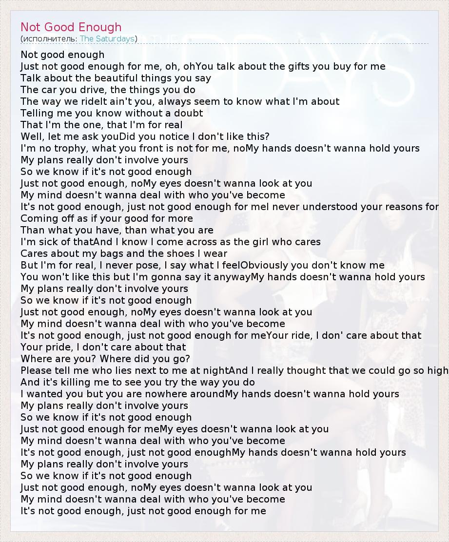 Not good enough Just not good enough for me, oh, ohYou talk about the gifts you buy for me Talk about the beautiful things you say The car you drive, the things you do The way we rideIt ain't you, always seem to know what I'm about Telling me you know without a doubt That I'm the one, that I'm for real Well, let me ask youDid you notice I don't like this? I'm no trophy, what you front is not for me, noMy hands doesn't wanna hold yours My plans really don't involve yours So we know if it's not good enough Just not good enough, noMy eyes doesn't wanna look at you My mind doesn't wanna deal with who you've become It's not good enough, just not good enough for meI never understood your reasons for Coming off as if your good for more Than what you have, than what you are I'm sick of thatAnd I know I come across as the girl who cares Cares about my bags and the shoes I wear But I'm for real, I never pose, I say what I feelObviously you don't know me You won't like this but I'm gonna say it anywayMy hands doesn't wanna hold yours My plans really don't involve yours So we know if it's not good enough Just not good enough, noMy eyes doesn't wanna look at you My mind doesn't wanna deal with who you've become It's not good enough, just not good enough for meYour ride, I don' care about that Your pride, I don't care about that Where are you? Where did you go? Please tell me who lies next to me at nightAnd I really thought that we could go so high And it's killing me to see you try the way you do I wanted you but you are nowhere aroundMy hands doesn't wanna hold yours My plans really don't involve yours So we know if it's not good enough Just not good enough for meMy eyes doesn't wanna look at you My mind doesn't wanna deal with who you've become It's not good enough, just not good enoughMy hands doesn't wanna hold yours My plans really don't involve yours So we know if it's not good enough Just not good enough, noMy eyes doesn't wanna look at you My mind doesn't wanna deal with who you've become It's not good enough, just not good enough for me