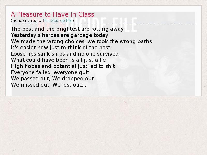 А как ты думаешь, о чем песня "A Pleasure to Have in Class" ?