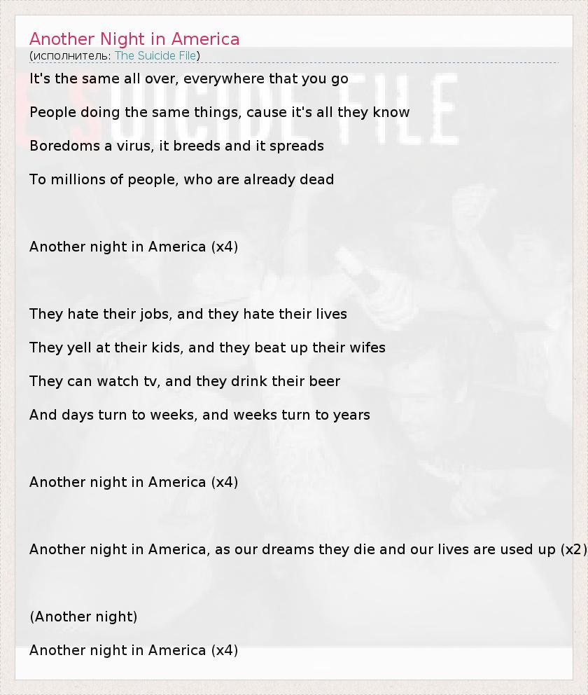 It's the same all over, everywhere that you go People doing the same things, cause it's all they know Boredoms a virus, it breeds and it spreads To millions of people, who are already dead Another night in America (x4) They hate their jobs, and they hate their lives They yell at their kids, and they beat up their wifes They can watch tv, and they drink their beer And days turn to weeks, and weeks turn to years Another night in America (x4) Another night in America, as our dreams they die and our lives are used up (x2) (Another night) Another night in America (x4)