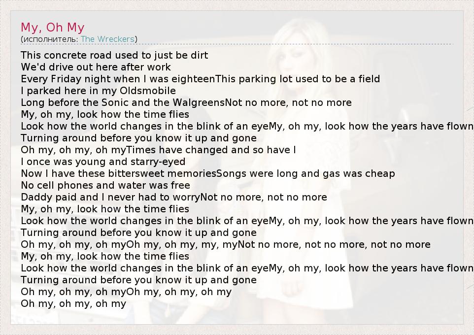 This concrete road used to just be dirt We'd drive out here after work Every Friday night when I was eighteenThis parking lot used to be a field I parked here in my Oldsmobile Long before the Sonic and the WalgreensNot no more, not no more My, oh my, look how the time flies Look how the world changes in the blink of an eyeMy, oh my, look how the years have flown Turning around before you know it up and gone Oh my, oh my, oh myTimes have changed and so have I I once was young and starry-eyed Now I have these bittersweet memoriesSongs were long and gas was cheap No cell phones and water was free Daddy paid and I never had to worryNot no more, not no more My, oh my, look how the time flies Look how the world changes in the blink of an eyeMy, oh my, look how the years have flown Turning around before you know it up and gone Oh my, oh my, oh myOh my, oh my, my, myNot no more, not no more, not no more My, oh my, look how the time flies Look how the world changes in the blink of an eyeMy, oh my, look how the years have flown Turning around before you know it up and gone Oh my, oh my, oh myOh my, oh my, oh my Oh my, oh my, oh my
