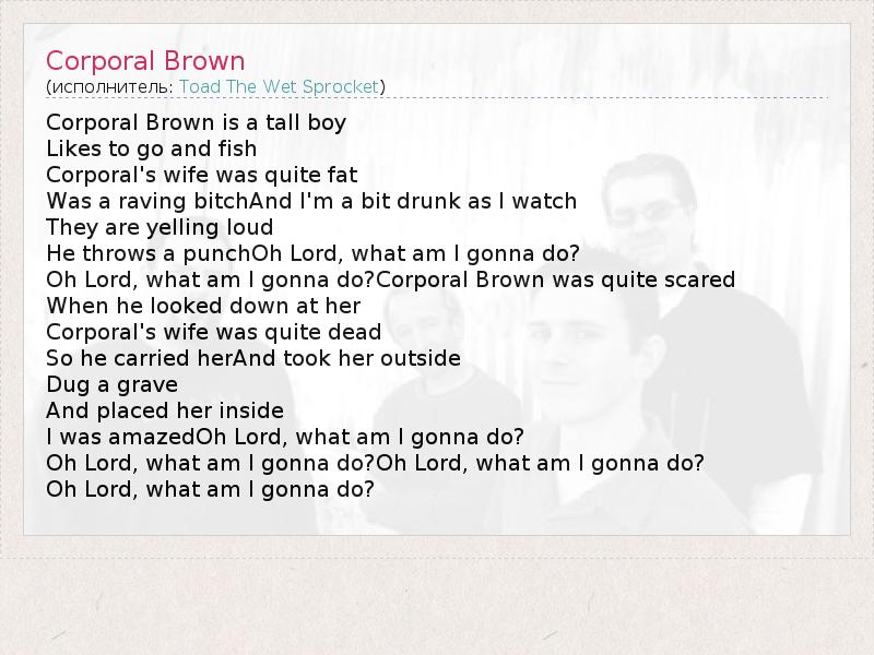 Corporal Brown is a tall boy Likes to go and fish Corporal's wife was quite fat Was a raving bitchAnd I'm a bit drunk as I watch They are yelling loud He throws a punchOh Lord, what am I gonna do? Oh Lord, what am I gonna do?Corporal Brown was quite scared When he looked down at her Corporal's wife was quite dead So he carried herAnd took her outside Dug a grave And placed her inside I was amazedOh Lord, what am I gonna do? Oh Lord, what am I gonna do?Oh Lord, what am I gonna do? Oh Lord, what am I gonna do?