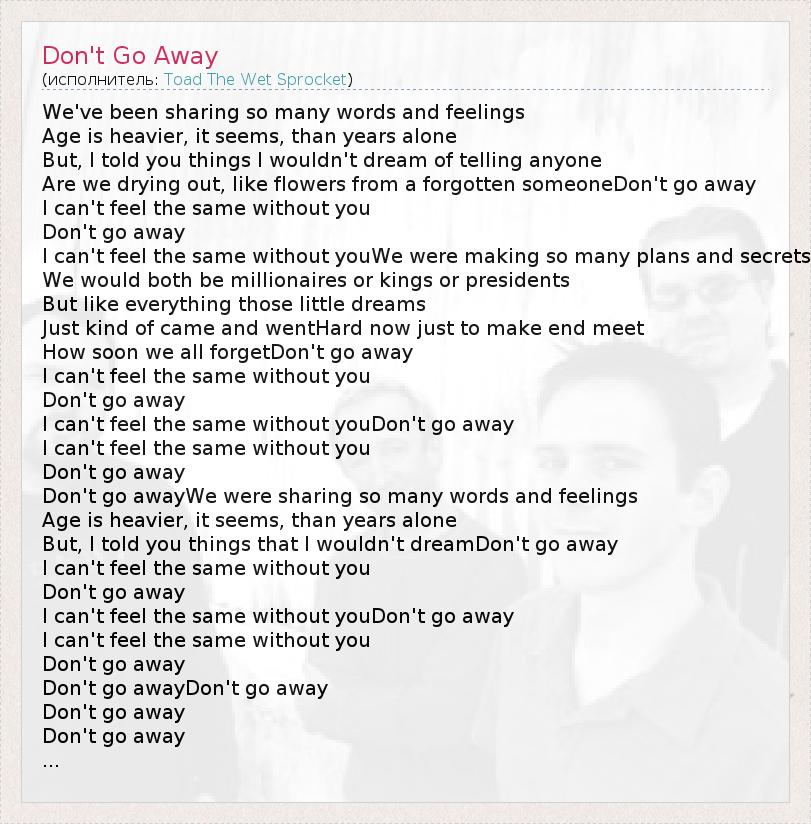 We've been sharing so many words and feelings Age is heavier, it seems, than years alone But, I told you things I wouldn't dream of telling anyone Are we drying out, like flowers from a forgotten someoneDon't go away I can't feel the same without you Don't go away I can't feel the same without youWe were making so many plans and secrets We would both be millionaires or kings or presidents But like everything those little dreams Just kind of came and wentHard now just to make end meet How soon we all forgetDon't go away I can't feel the same without you Don't go away I can't feel the same without youDon't go away I can't feel the same without you Don't go away Don't go awayWe were sharing so many words and feelings Age is heavier, it seems, than years alone But, I told you things that I wouldn't dreamDon't go away I can't feel the same without you Don't go away I can't feel the same without youDon't go away I can't feel the same without you Don't go away Don't go awayDon't go away Don't go away Don't go away ...