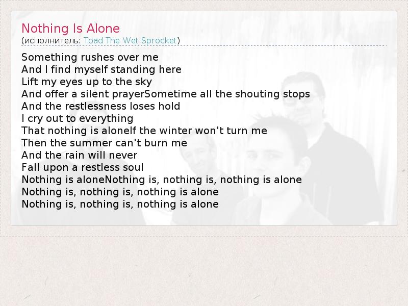 Something rushes over me And I find myself standing here Lift my eyes up to the sky And offer a silent prayerSometime all the shouting stops And the restlessness loses hold I cry out to everything That nothing is aloneIf the winter won't turn me Then the summer can't burn me And the rain will never Fall upon a restless soul Nothing is aloneNothing is, nothing is, nothing is alone Nothing is, nothing is, nothing is alone Nothing is, nothing is, nothing is alone