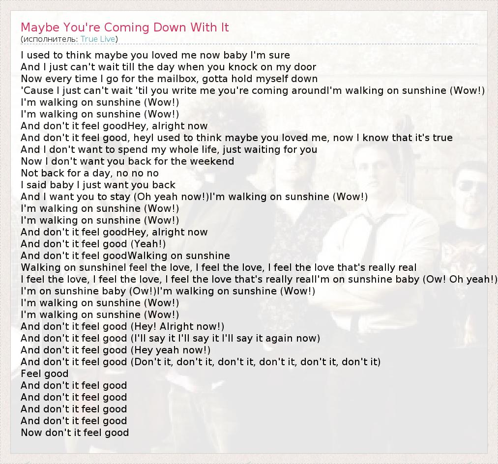 I used to think maybe you loved me now baby I'm sure And I just can't wait till the day when you knock on my door Now every time I go for the mailbox, gotta hold myself down 'Cause I just can't wait 'til you write me you're coming aroundI'm walking on sunshine (Wow!) I'm walking on sunshine (Wow!) I'm walking on sunshine (Wow!) And don't it feel goodHey, alright now And don't it feel good, heyI used to think maybe you loved me, now I know that it's true And I don't want to spend my whole life, just waiting for you Now I don't want you back for the weekend Not back for a day, no no no I said baby I just want you back And I want you to stay (Oh yeah now!)I'm walking on sunshine (Wow!) I'm walking on sunshine (Wow!) I'm walking on sunshine (Wow!) And don't it feel goodHey, alright now And don't it feel good (Yeah!) And don't it feel goodWalking on sunshine Walking on sunshineI feel the love, I feel the love, I feel the love that's really real I feel the love, I feel the love, I feel the love that's really realI'm on sunshine baby (Ow! Oh yeah!) I'm on sunshine baby (Ow!)I'm walking on sunshine (Wow!) I'm walking on sunshine (Wow!) I'm walking on sunshine (Wow!) And don't it feel good (Hey! Alright now!) And don't it feel good (I'll say it I'll say it I'll say it again now) And don't it feel good (Hey yeah now!) And don't it feel good (Don't it, don't it, don't it, don't it, don't it, don't it) Feel good And don't it feel good And don't it feel good And don't it feel good And don't it feel good Now don't it feel good