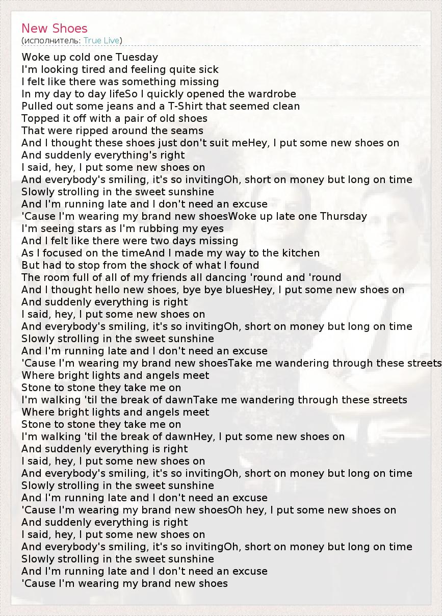 Woke up cold one Tuesday I'm looking tired and feeling quite sick I felt like there was something missing In my day to day lifeSo I quickly opened the wardrobe Pulled out some jeans and a T-Shirt that seemed clean Topped it off with a pair of old shoes That were ripped around the seams And I thought these shoes just don't suit meHey, I put some new shoes on And suddenly everything's right I said, hey, I put some new shoes on And everybody's smiling, it's so invitingOh, short on money but long on time Slowly strolling in the sweet sunshine And I'm running late and I don't need an excuse 'Cause I'm wearing my brand new shoesWoke up late one Thursday I'm seeing stars as I'm rubbing my eyes And I felt like there were two days missing As I focused on the timeAnd I made my way to the kitchen But had to stop from the shock of what I found The room full of all of my friends all dancing 'round and 'round And I thought hello new shoes, bye bye bluesHey, I put some new shoes on And suddenly everything is right I said, hey, I put some new shoes on And everybody's smiling, it's so invitingOh, short on money but long on time Slowly strolling in the sweet sunshine And I'm running late and I don't need an excuse 'Cause I'm wearing my brand new shoesTake me wandering through these streets Where bright lights and angels meet Stone to stone they take me on I'm walking 'til the break of dawnTake me wandering through these streets Where bright lights and angels meet Stone to stone they take me on I'm walking 'til the break of dawnHey, I put some new shoes on And suddenly everything is right I said, hey, I put some new shoes on And everybody's smiling, it's so invitingOh, short on money but long on time Slowly strolling in the sweet sunshine And I'm running late and I don't need an excuse 'Cause I'm wearing my brand new shoesOh hey, I put some new shoes on And suddenly everything is right I said, hey, I put some new shoes on And everybody's smiling, it's so invitingOh, short on money but long on time Slowly strolling in the sweet sunshine And I'm running late and I don't need an excuse 'Cause I'm wearing my brand new shoes