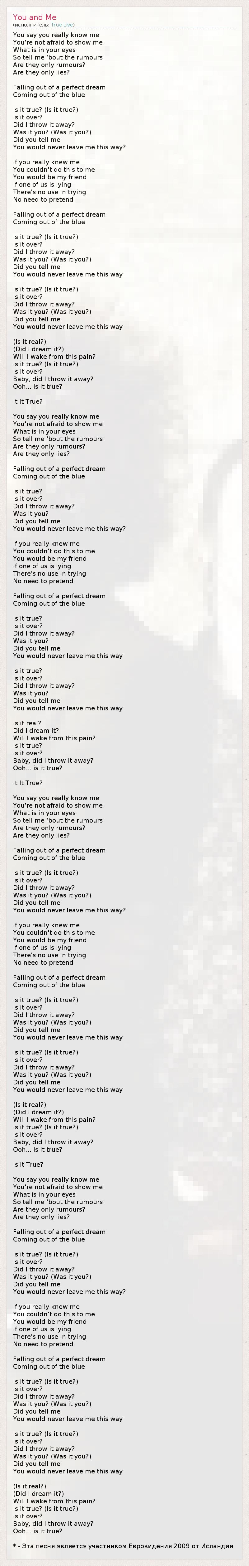 You say you really know me You're not afraid to show me What is in your eyes So tell me 'bout the rumours Are they only rumours? Are they only lies? Falling out of a perfect dream Coming out of the blue Is it true? (Is it true?) Is it over? Did I throw it away? Was it you? (Was it you?) Did you tell me You would never leave me this way? If you really knew me You couldn't do this to me You would be my friend If one of us is lying There's no use in trying No need to pretend Falling out of a perfect dream Coming out of the blue Is it true? (Is it true?) Is it over? Did I throw it away? Was it you? (Was it you?) Did you tell me You would never leave me this way Is it true? (Is it true?) Is it over? Did I throw it away? Was it you? (Was it you?) Did you tell me You would never leave me this way (Is it real?) (Did I dream it?) Will I wake from this pain? Is it true? (Is it true?) Is it over? Baby, did I throw it away? Ooh... is it true? It It True? You say you really know me You're not afraid to show me What is in your eyes So tell me 'bout the rumours Are they only rumours? Are they only lies? Falling out of a perfect dream Coming out of the blue Is it true? Is it over? Did I throw it away? Was it you? Did you tell me You would never leave me this way? If you really knew me You couldn't do this to me You would be my friend If one of us is lying There's no use in trying No need to pretend Falling out of a perfect dream Coming out of the blue Is it true? Is it over? Did I throw it away? Was it you? Did you tell me You would never leave me this way Is it true? Is it over? Did I throw it away? Was it you? Did you tell me You would never leave me this way Is it real? Did I dream it? Will I wake from this pain? Is it true? Is it over? Baby, did I throw it away? Ooh... is it true? It It True? You say you really know me You're not afraid to show me What is in your eyes So tell me 'bout the rumours Are they only rumours? Are they only lies? Falling out of a perfect dream Coming out of the blue Is it true? (Is it true?) Is it over? Did I throw it away? Was it you? (Was it you?) Did you tell me You would never leave me this way? If you really knew me You couldn't do this to me You would be my friend If one of us is lying There's no use in trying No need to pretend Falling out of a perfect dream Coming out of the blue Is it true? (Is it true?) Is it over? Did I throw it away? Was it you? (Was it you?) Did you tell me You would never leave me this way Is it true? (Is it true?) Is it over? Did I throw it away? Was it you? (Was it you?) Did you tell me You would never leave me this way (Is it real?) (Did I dream it?) Will I wake from this pain? Is it true? (Is it true?) Is it over? Baby, did I throw it away? Ooh... is it true? Is It True? You say you really know me You're not afraid to show me What is in your eyes So tell me 'bout the rumours Are they only rumours? Are they only lies? Falling out of a perfect dream Coming out of the blue Is it true? (Is it true?) Is it over? Did I throw it away? Was it you? (Was it you?) Did you tell me You would never leave me this way? If you really knew me You couldn't do this to me You would be my friend If one of us is lying There's no use in trying No need to pretend Falling out of a perfect dream Coming out of the blue Is it true? (Is it true?) Is it over? Did I throw it away? Was it you? (Was it you?) Did you tell me You would never leave me this way Is it true? (Is it true?) Is it over? Did I throw it away? Was it you? (Was it you?) Did you tell me You would never leave me this way (Is it real?) (Did I dream it?) Will I wake from this pain? Is it true? (Is it true?) Is it over? Baby, did I throw it away? Ooh... is it true? * - Эта песня является участником Евровидения 2009 от Исландии