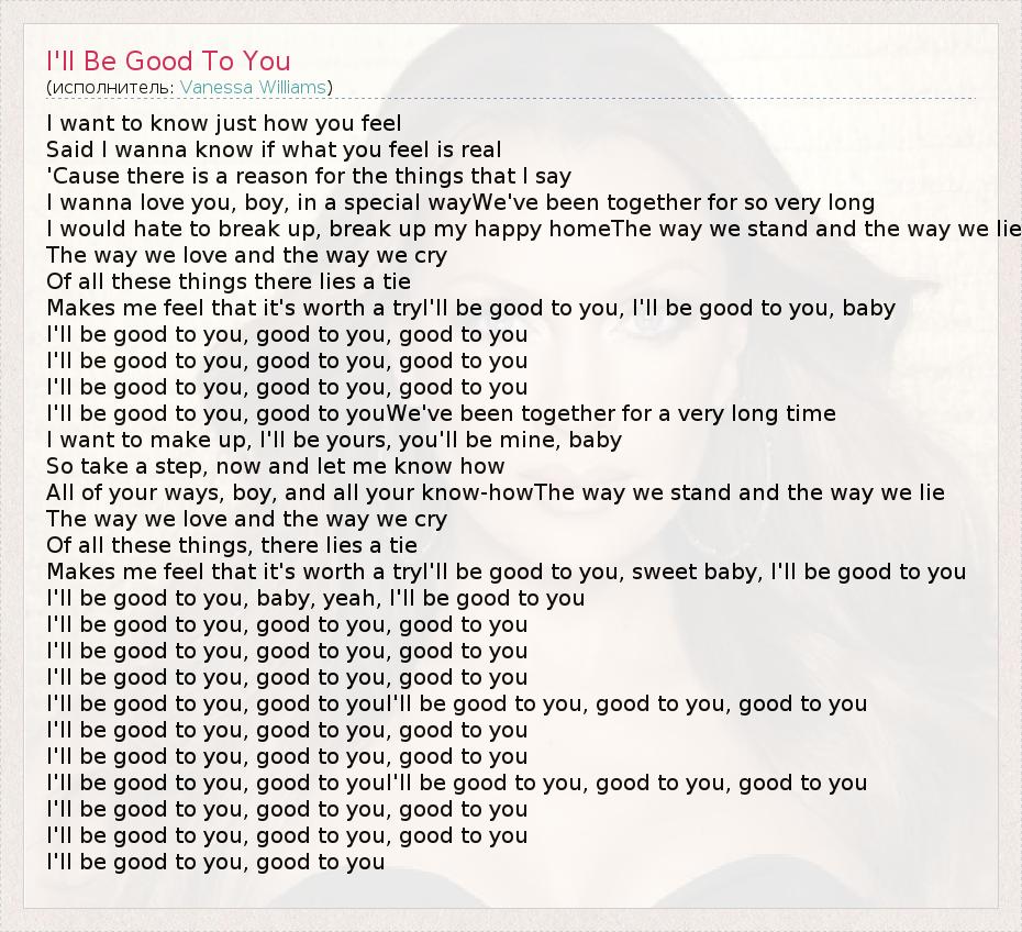 I want to know just how you feel Said I wanna know if what you feel is real 'Cause there is a reason for the things that I say I wanna love you, boy, in a special wayWe've been together for so very long I would hate to break up, break up my happy homeThe way we stand and the way we lie The way we love and the way we cry Of all these things there lies a tie Makes me feel that it's worth a tryI'll be good to you, I'll be good to you, baby I'll be good to you, good to you, good to you I'll be good to you, good to you, good to you I'll be good to you, good to you, good to you I'll be good to you, good to youWe've been together for a very long time I want to make up, I'll be yours, you'll be mine, baby So take a step, now and let me know how All of your ways, boy, and all your know-howThe way we stand and the way we lie The way we love and the way we cry Of all these things, there lies a tie Makes me feel that it's worth a tryI'll be good to you, sweet baby, I'll be good to you I'll be good to you, baby, yeah, I'll be good to you I'll be good to you, good to you, good to you I'll be good to you, good to you, good to you I'll be good to you, good to you, good to you I'll be good to you, good to youI'll be good to you, good to you, good to you I'll be good to you, good to you, good to you I'll be good to you, good to you, good to you I'll be good to you, good to youI'll be good to you, good to you, good to you I'll be good to you, good to you, good to you I'll be good to you, good to you, good to you I'll be good to you, good to you
