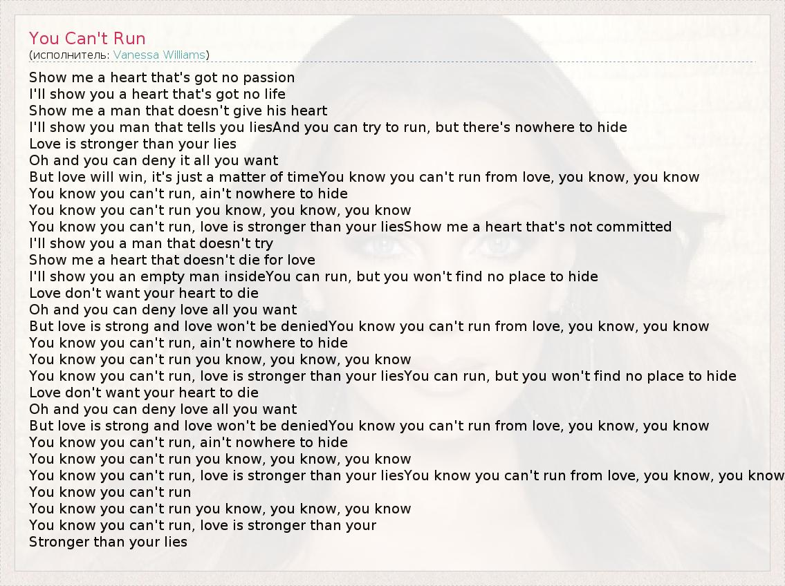 You know you can't run, love is stronger than your liesYou can run, but you won't find no place to hide