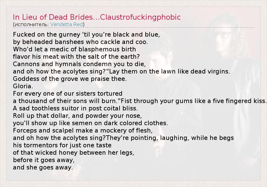 А как ты думаешь, о чем песня "In Lieu of Dead Brides...Claustrofuckingphobic" ?