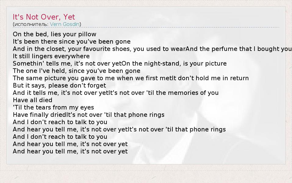 On the bed, lies your pillow It's been there since you've been gone And in the closet, your favourite shoes, you used to wearAnd the perfume that I bought you It still lingers everywhere Somethin' tells me, it's not over yetOn the night-stand, is your picture The one I've held, since you've been gone The same picture you gave to me when we first metIt don't hold me in return But it says, please don't forget And it tells me, it's not over yetIt's not over 'til the memories of you Have all died 'Til the tears from my eyes Have finally driedIt's not over 'til that phone rings And I don't reach to talk to you And hear you tell me, it's not over yetIt's not over 'til that phone rings And I don't reach to talk to you And hear you tell me, it's not over yet And hear you tell me, it's not over yet