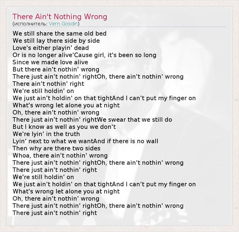 We still share the same old bed We still lay there side by side Love's either playin' dead Or is no longer alive'Cause girl, it's been so long Since we made love alive But there ain't nothin' wrong There just ain't nothin' rightOh, there ain't nothin' wrong There ain't nothin' right We're still holdin' on We just ain't holdin' on that tightAnd I can't put my finger on What's wrong let alone you at night Oh, there ain't nothin' wrong There just ain't nothin' rightWe swear that we still do But I know as well as you we don't We're lyin' in the truth Lyin' next to what we wantAnd if there is no wall Then why are there two sides Whoa, there ain't nothin' wrong There just ain't nothin' rightOh, there ain't nothin' wrong There just ain't nothin' right We're still holdin' on We just ain't holdin' on that tightAnd I can't put my finger on What's wrong let alone you at night Oh, there ain't nothin' wrong There just ain't nothin' rightOh, there ain't nothin' wrong There just ain't nothin' right